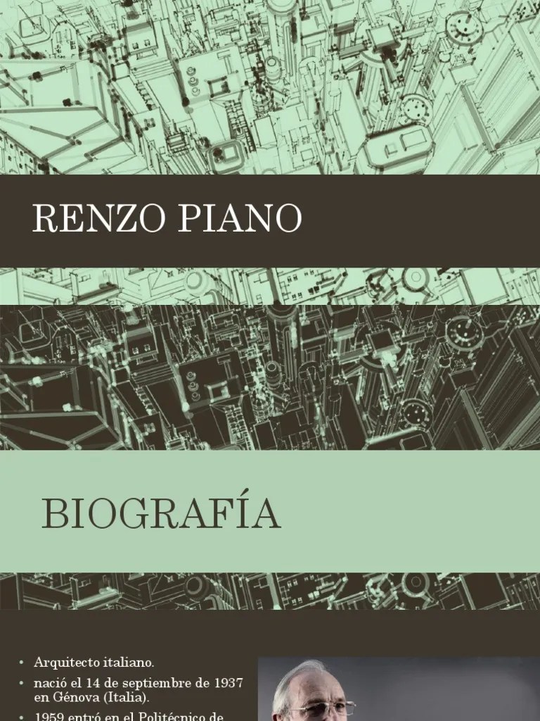 Uno de los más conocidos y famosos arquitectos de la época contemporánea, renzo piano nace en génova en 1937, en el seno de una familia de constructores... Uno de los más conocidos y famosos arquitectos de la época contemporánea, renzo piano nace en génova en 1937, en el seno de una familia de constructores. Consigue el diploma de bachillerato en letras, para después licenciarse en arquitectura por el politécnico de milán en 1964. Desde que en 1977 cambiara el curso de la arquitectura moderna con la construcción del centro georges pompidou, renzo piano no ha dejado de evolucionar y aun de sorprender con cada uno de sus proyectos. Renzo piano (génova, 1937) arquitecto italiano... Uno de los más conocidos y famosos arquitectos de la época contemporánea, renzo piano nace en génova en 1937, en el seno de una familia de constructores.