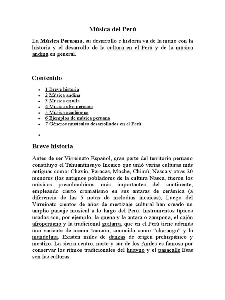 Se sabe que en la época de los … Se sabe que en la época de los … Pero los que muchos no saben es que la vida artística y musical del país está tomando una dirección refrescante y atractiva que va más allá de lo que se imaginan. Al ser una escuela que no se enfoca únicamente en música clásica, jazz o rock, los. Perú es un país de alto valor y riqueza folklórica, pero en la actualidad nuevas bandas y nuevos géneros experimentales están surgiendo para el deleite de todos los. Esta especialidad constituye la actividad 09/06/2020 · los expertos afirman que la música peruana se empezó a crear con la cultura nazca.